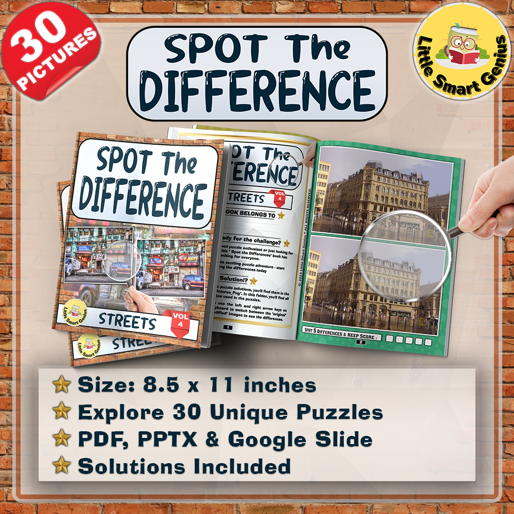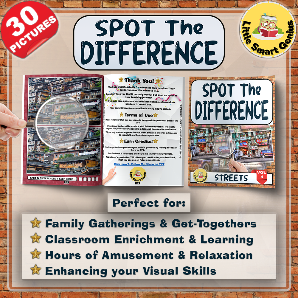 30 Unique Pictures : Dive into a world of variety as each of the 30 pages offers a new set of images to compare. Get ready for long-lasting fun and a cognitive workout!
